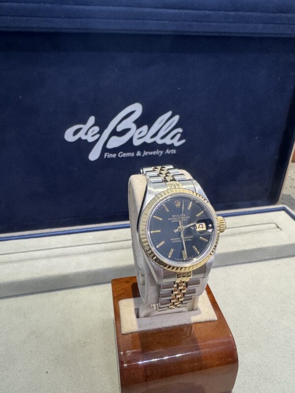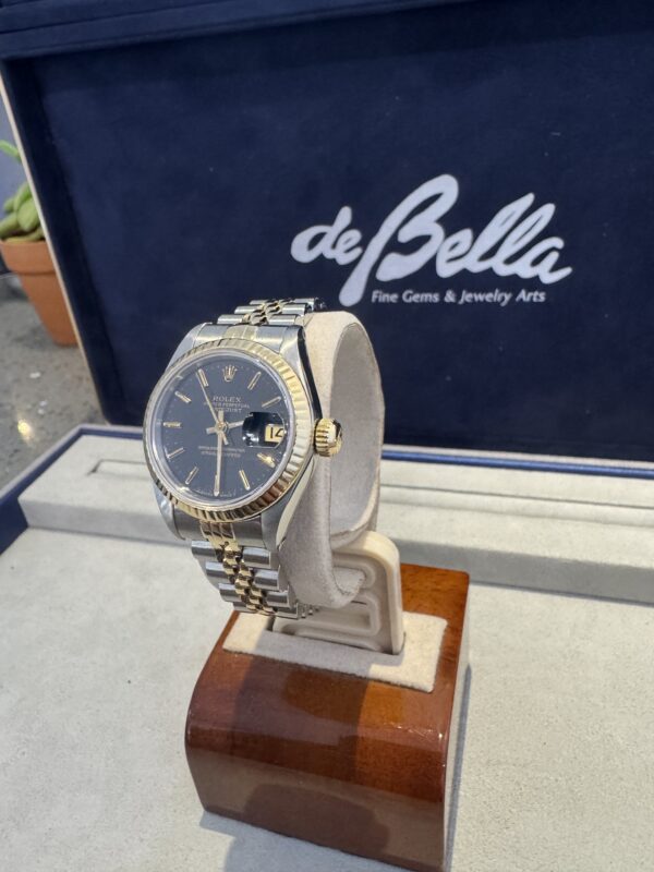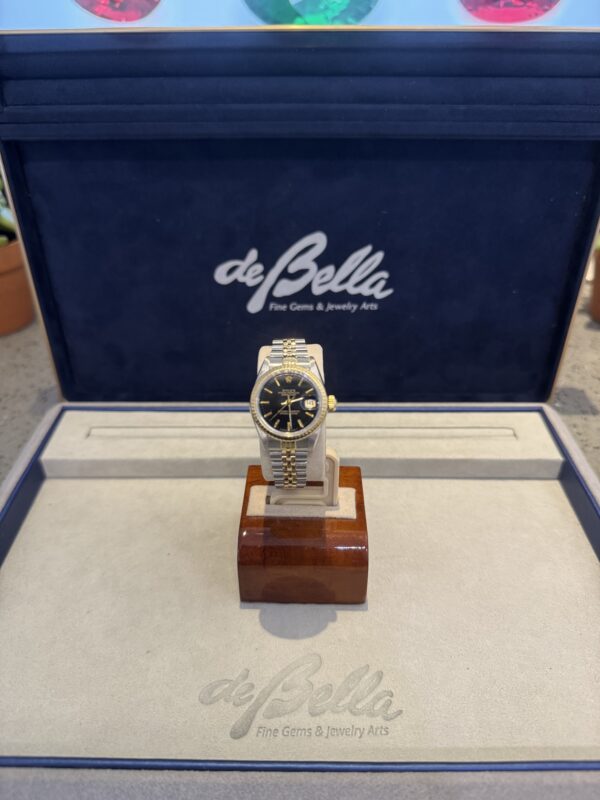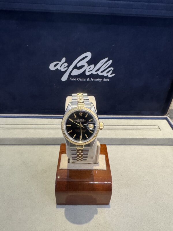 Classic Pre Owned Ladies Stainless Steel & Yellow Gold Rolex Datejust with Black Dial and Jubilee style bracelet offered with 2 Year Warranty. Timepieces are available in-store with inquiries welcome. Let us help you find and love your dream watch.