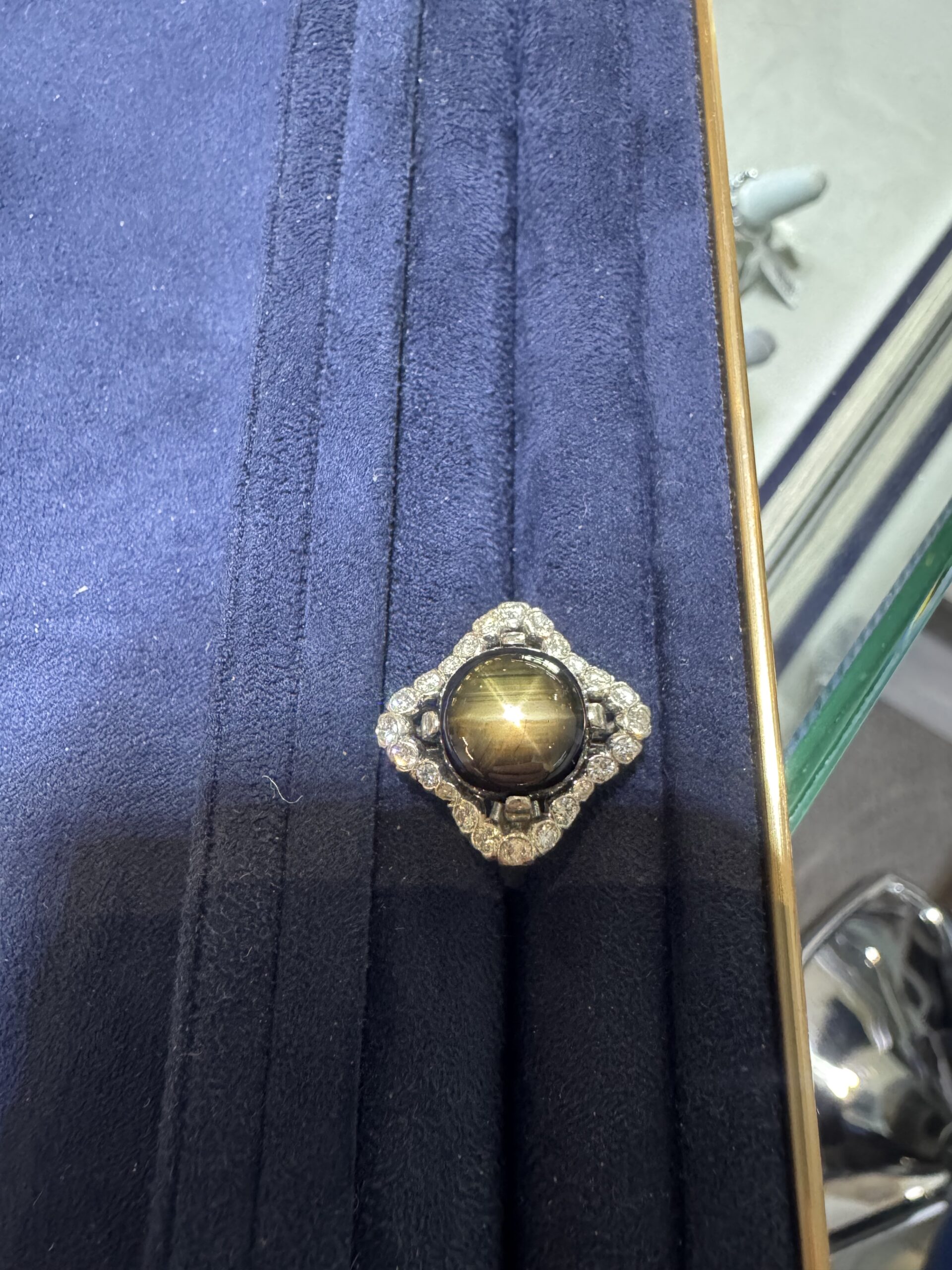 Categories: Jewelry, Sapphire Description Platinum Estate Ring featuring a 8.50 CT Black Star Sapphire and accented with Brilliant Cut Round Diamonds Related products Tiffany 4ct Pear Shape Blue Sapphire GIA & Diamond 18k Pendant See More Ruby & Sapphire 18k Yellow Gold Gents Bands See More 3ct Diamond & Platinum Pendant See More