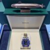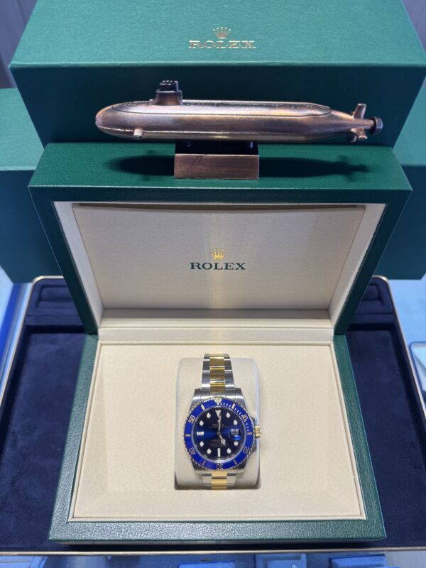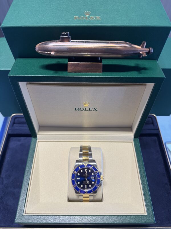 Pre-Owned 18k Yellow Gold & Stainless Steel Blue Rolex Submariner with Blue Cerachrom Bezel and Date complication offered with Rolex Box & Card along with New-Issue 2 Year Warranty Card. Timepieces are available in-store with inquiries welcome. Let us help own and wear your dream watch.