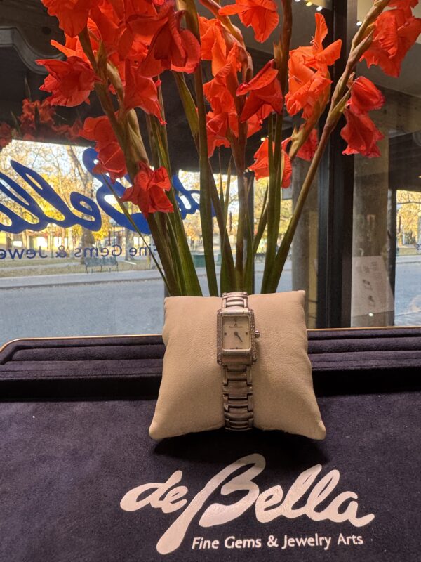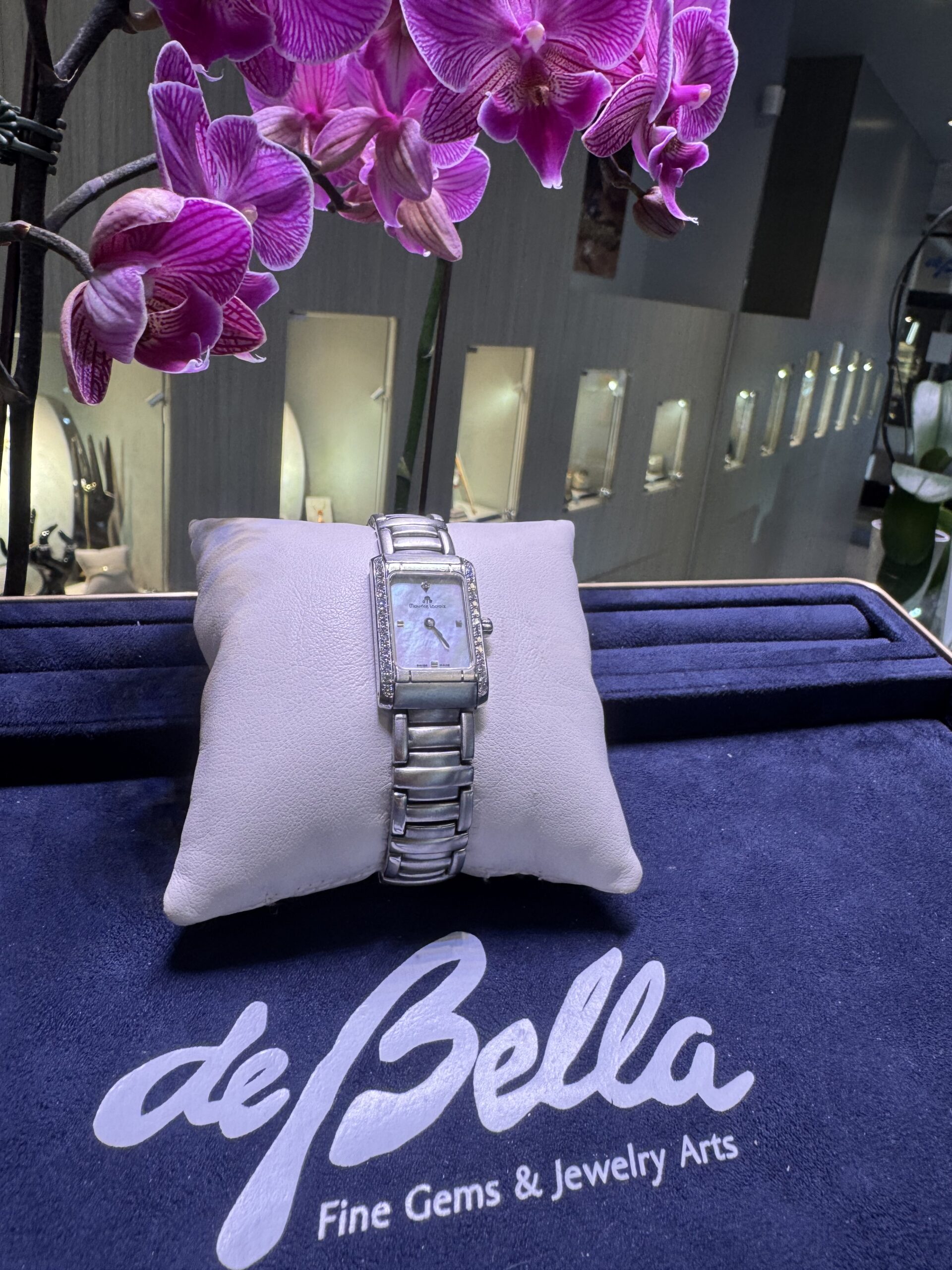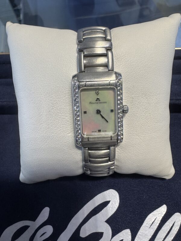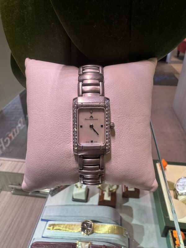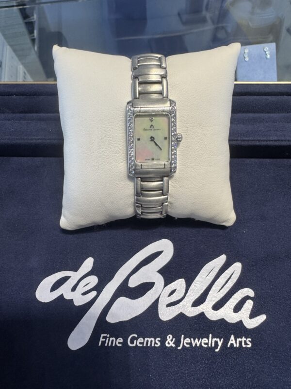 Stainless Steel Maurice Lacroix with Mother of Pearl Dial & Diamond Bezel Quartz movement. Timepieces are offered in-store with inquiries welcome.