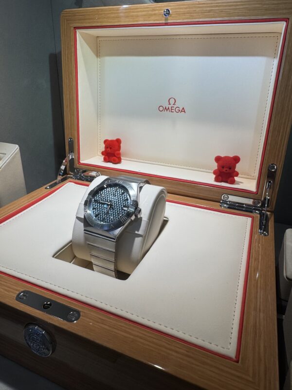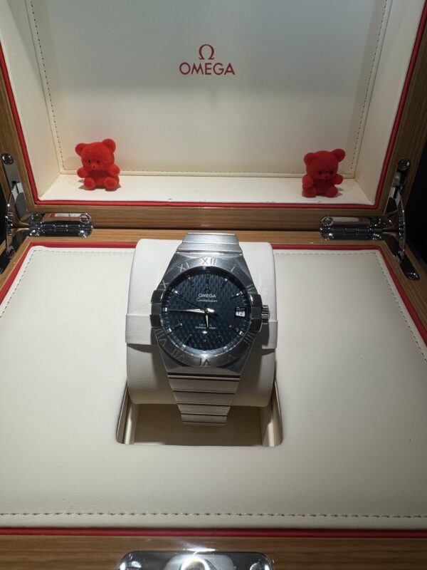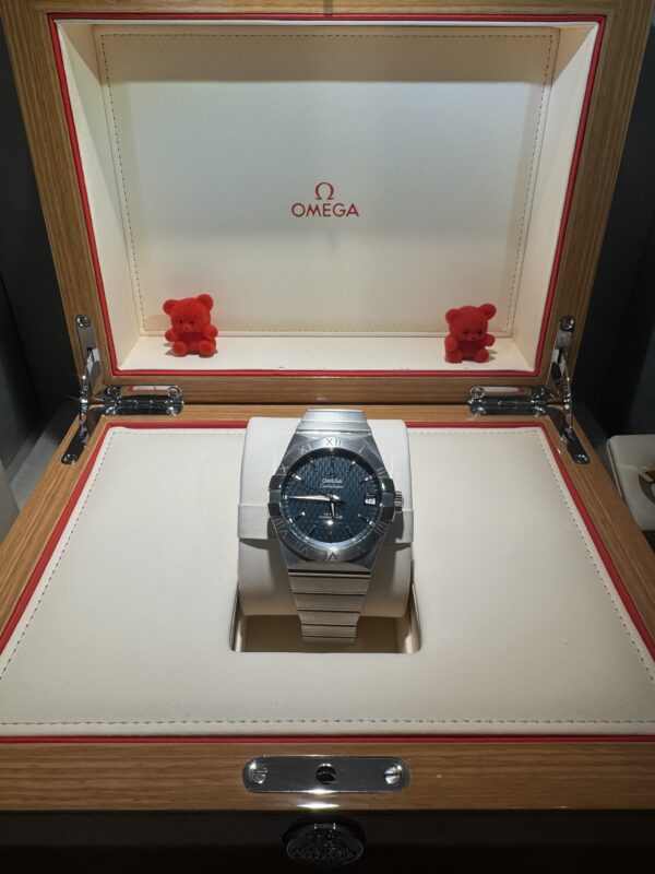 Omega Constellation 39mm with Blue Smoke Pyramid Dial available with original wood Omega Box, Card, and Manuals. Timepieces are offered in-store with inquiries welcome. Let us help you find and wear your dream watch.